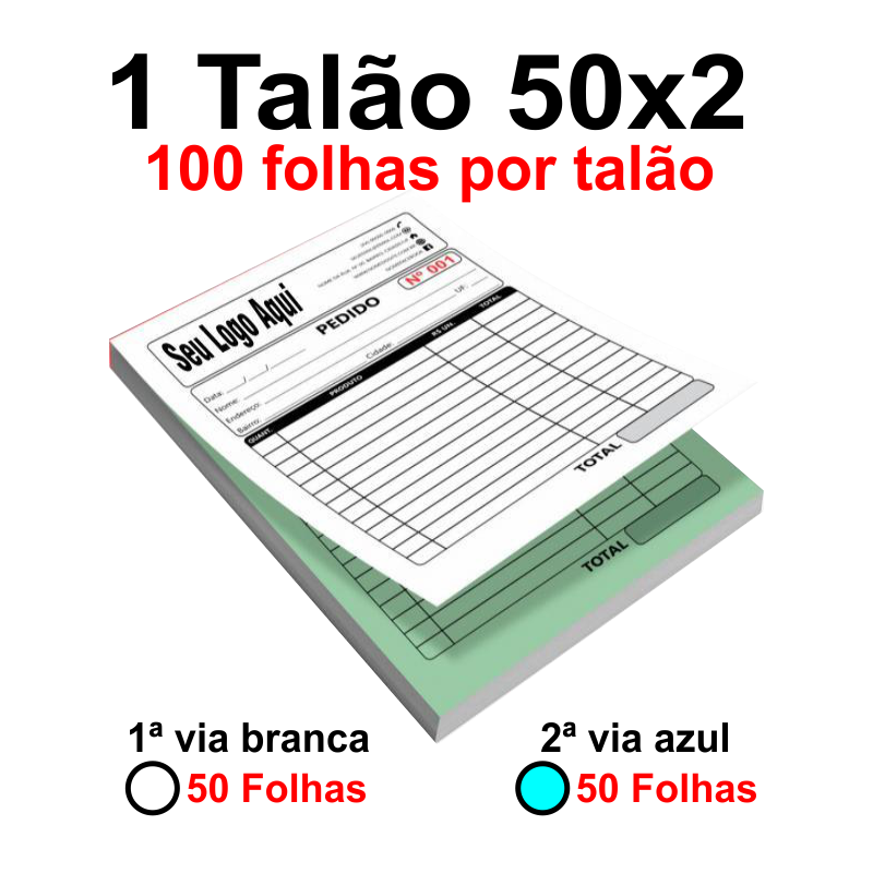 A quantidade final deste produto é referente ao número de folhas e não de blocos – Por exemplo: 100 unidades = 1 Bloco 50×2 vias.