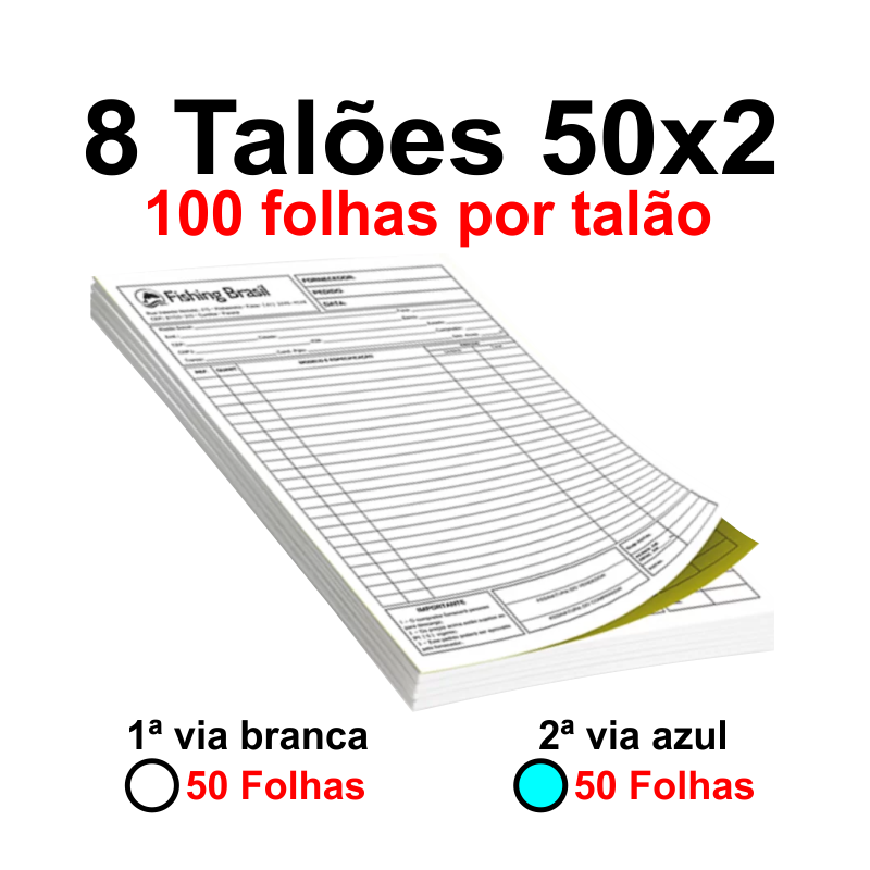 A quantidade final deste produto é referente ao número de folhas e não de blocos – Por exemplo: 100 unidades = 1 Talão 50×2 vias.
